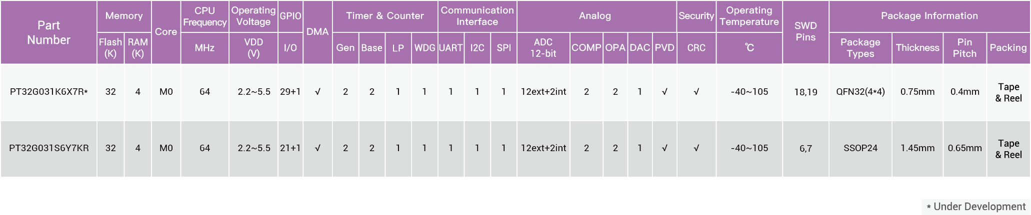 PT32G031x 系列产品提供从 20 到 32 引脚的不同封装形式;根据不同的封装形式,器件中的外设配置不尽相同。下面的表格中将罗列该系列产品中所有外设的基本介绍,这些丰富的外设配置,这些丰富的外设配置,使得 PT32G031x 系列产品适合于多种应用场合: