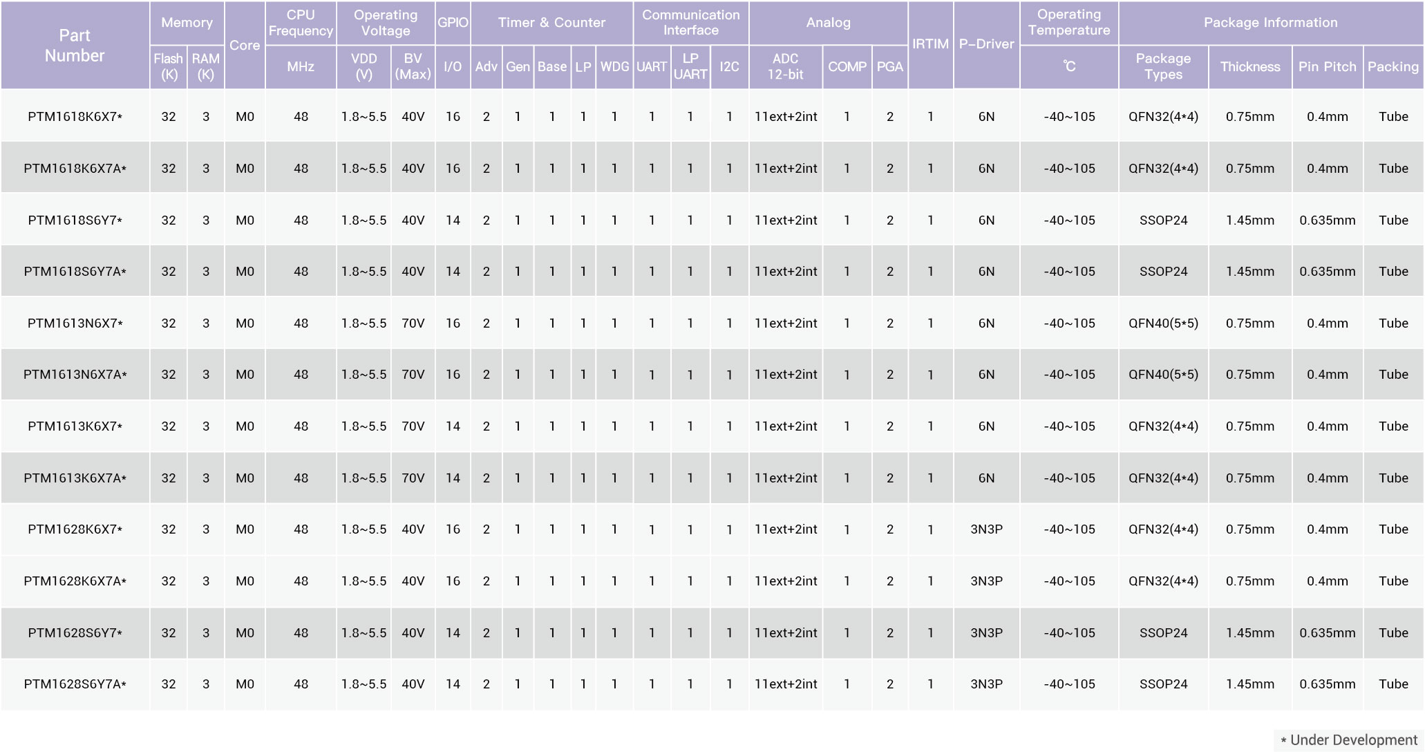 PTM160x 系列使用高性能,低功耗的 Cortex™-M0 32 位内核,通用工作频率最大 48MHz。内置高速存储器(32KB 的 Flash 和 3KB 的 SRAM),多功能复用的 I/O 端口和连接到 APB 总线的丰富外设。
