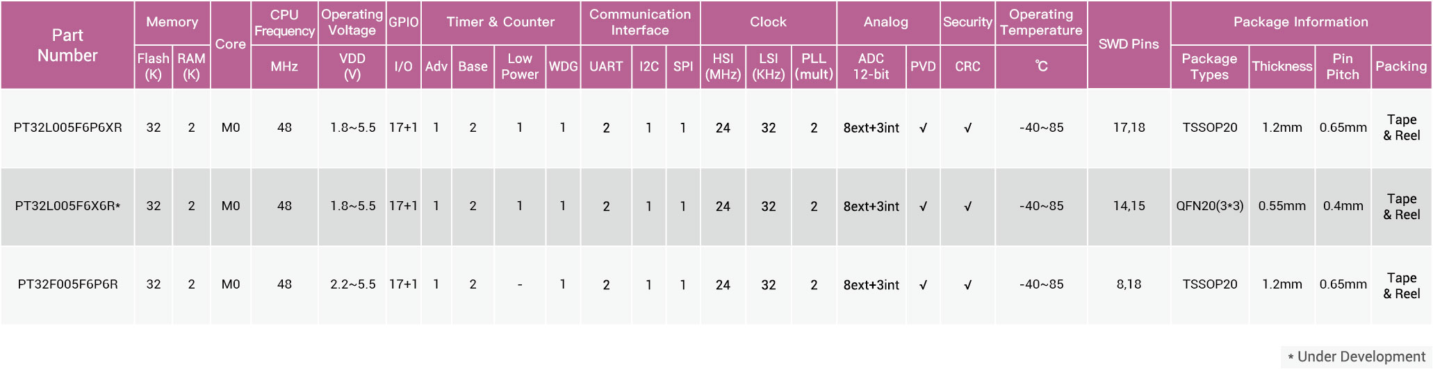 PT32F005x是基于Cortex-M0内核的一款32位低功耗高性能MCU。 内置多达32KB高速Flash存储器及多达2KB SRAM。最高工作频率可达48MHz,支持工作电压2.2~5.5v,工作温度为-40~+85度。具有丰富的外设功能: 多达18个快速GPIO端口,集成2路UART,1路SPI,1路I2C,并提供1个多达8通道的12bit ADC及多达5个各类定时器。支持两种低功耗模式。