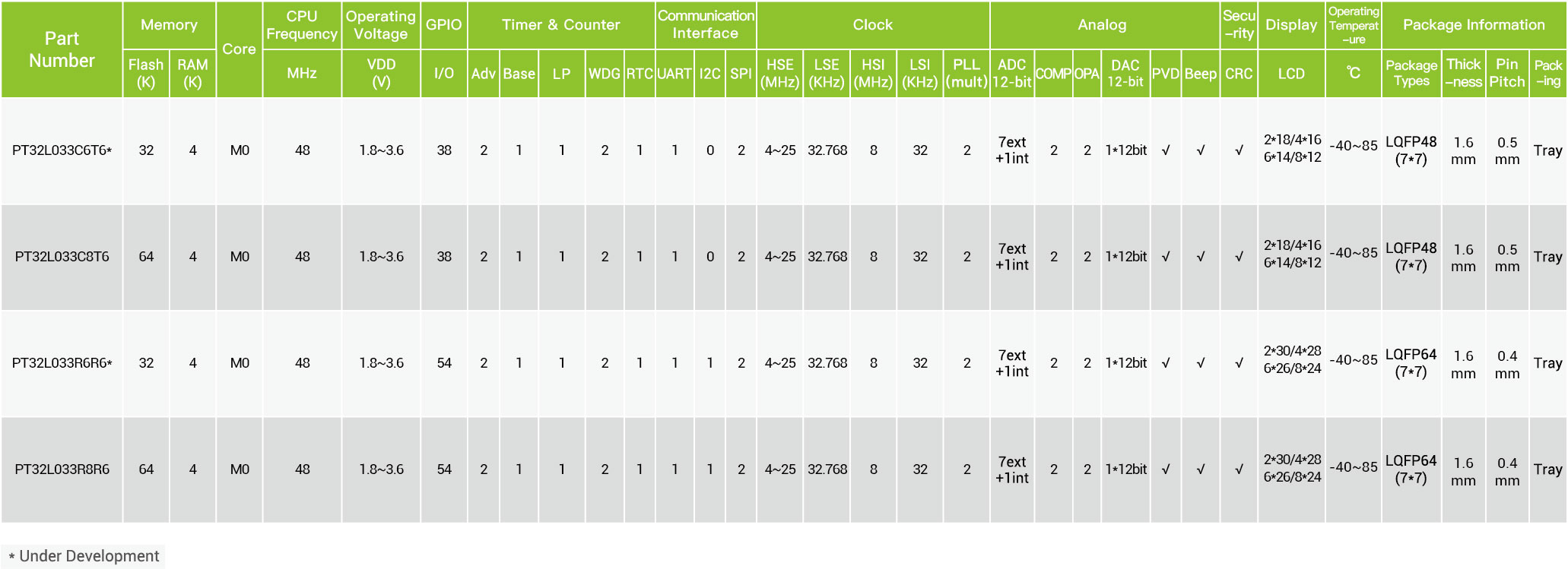 PT32L033是基于Cortex-M0内核的一款32位高性能MCU,支持工作电压1.8~3.6v,工作温度为-40~+85度。内部集成了1个10通道12位500K采样率的SARADC,1路UART, 2路SPI,1路I2C,1路DAC等丰富的串口外设,支持RTC,LCD显示,外部32.768KHz晶振,高级定时器Timer0/1,普通定时器Timer2,特别支持内部比较器/OPA。支持Sleep模式和Deep Sleep模式。支持低电压检测功能,看门狗唤醒,芯片内部唯一码,CRC校验等功能。