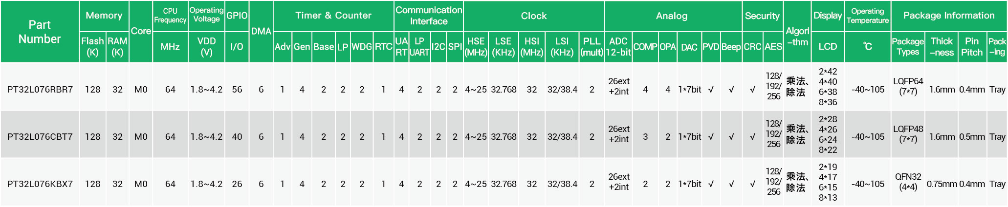 PT32L076xx是基于Cortex-M0内核的一款32位高性能MCU,最高主频支持64MHz,Flash 64/128Kbyte, RAM 16/32Kbyte, 支持工作电压1.8~4.2v, 工作温度为-40~+105度。支持外部4~25MHz高速晶体振荡器及32.768KHz低速晶体振荡器,支持内部32MHz高速RC振荡器及32K/38.4K低速RC振荡器,支持PLL倍频。内部集成了6通道DMA控制器,4路 UART,2路LPUART,2路SPI,2路I2C等丰富的串口外设,12位1M采样率的SARADC,支持26个外部通道,多达11个定时器,其中包括1 个 16 位带死区控制和紧急刹车,用于电机控制的高级控制定时器 TIM1,1 个 16 位用于辅助电机控制的高级控制定时器 TIM8,3个16位通用定时器TIM5/6/7, 2个16位基本定时器TIM2/3, 1个16位低功耗定时器TIM4,1个可用于低功耗下电机控制TIM10,1个独立看门狗1个窗口看门狗。支持液晶显示LCD接口,其中包括2*42、4*40、6*38及8*36等,支持7位DAC,4路比较器,4路运算放大器。部分IO大电流驱动功能。支持Sleep模式和Deep Sleep模式。支持AES128/192/256, 乘法器&除法器,低电压检测功能,看门狗唤醒,芯片内部唯一码,CRC校验等功能。