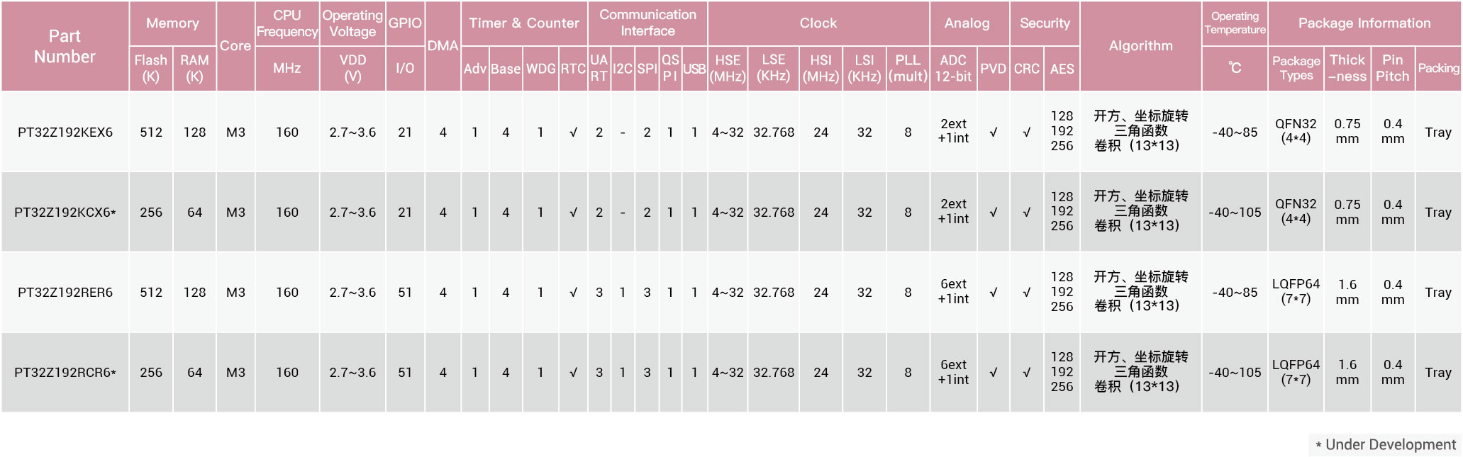 PT32Z192是基于Cortex-M3内核的一款32位高性能MCU,最高主频为160MHz,工作电压:2.7~3.6v,工作温度-40~85°C,支持512/256KByte Flash,128/64KByte RAM,支持4Kbyte Cache,内部RC支持24MHz和32KHz,外部晶振支持24MHz,支持PLL,支持1个高级定时器,4个通用定时器,支持3个UART,2个SPI,1个QSPI,1个I2C,USB1.1,AES,支持开方/坐标旋转/三角函数/卷积(13*13)等。支持LQFP64封装。